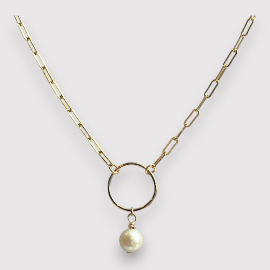 Love, Hope, and Joy genuine pearl, cz, and heart gold necklace.